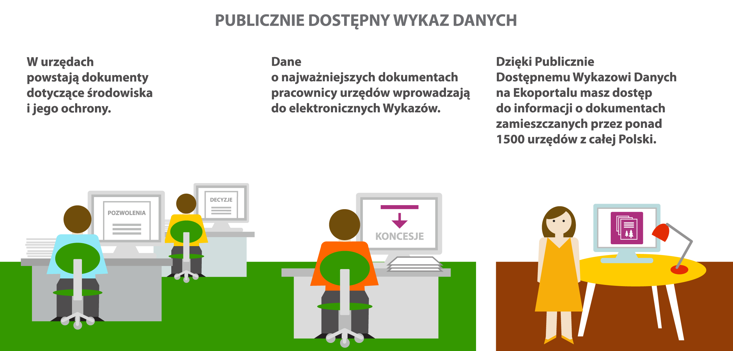 Wiele instytucji publicznych tworzy, zmienia i publikuje dokumenty, które zawierają informacje o środowisku naturalnym i jego ochronie. Dane o dokumentach zawierających informacje o środowisku, objętych ustawowym obowiązkiem opisywania i rejestrowania, instytucje powinny udostępniać za pomocą tzw. publicznie dostępnych wykazów danych, w skrócie PDWD. Wykaz taki stanowi zbiór kart informacyjnych, z których każda opisuje pojedynczy dokument, jego miejsce przechowywania oraz odniesienie do dokumentów z nim powiązanych.